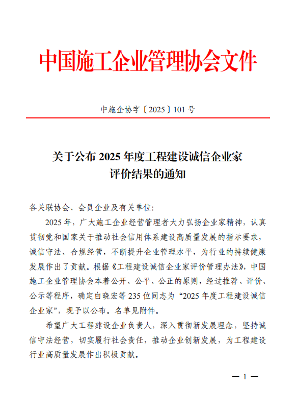 公司总经理孙露超荣获2025 年度工程建设诚信企业家
